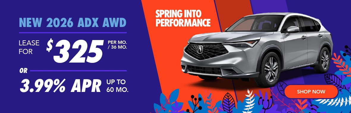 *Offers subject to change. See dealer for details. Lease does not include tax, tag, and title. Does not include dealer installed accessories, $565 administrative fee, or $600 color upcharge. New 2026 Acura ADX AWD lease. $325/month for 36 months and 7,500 miles a year. $4,999 down. $1,000 cap cost reduction. Must qualify for Loyalty/Conquest Offer. Loyalty/Conquest Eligibility: Current owners of any 2011 or newer Acura, Audi, BMW, Buick, Cadillac, Chevrolet, Chrysler, Dodge, Ford, Genesis, GMC, Honda, Hyundai, Infiniti, Jeep, Kia, Lexus, Mazda, Mercedes-Benz, Nissan, Ram, Subaru, Toyota, Volkswagen or Volvo vehicle. 3.99% financing and special lease offer are available for well qualified buyers, and is subject to approval. Offers run 03/03/2026 through 03/31/2026.
