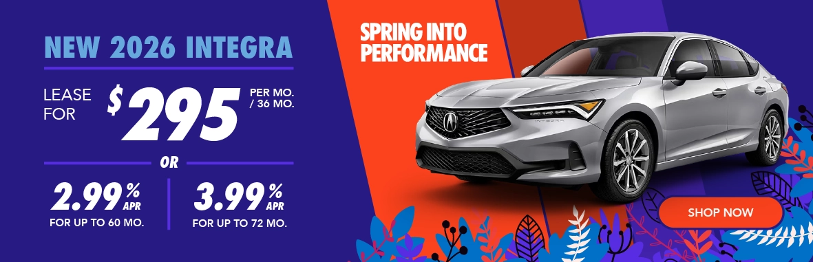 *Offers subject to change. See dealer for details. Lease does not include tax, tag, and title. Does not include dealer installed accessories, $565 administrative fee, or $600 color upcharge. New 2026 Acura Integra lease. $295/month for 36 months and 7,500 miles a year. $3,999 down. Dealers set actual prices. $2,000 cap cost reduction. Must qualify for Loyalty/Conquest Offer. Loyalty/Conquest Eligibility: Current owners of any 2011 or newer Acura, Audi, BMW, Buick, Cadillac, Chevrolet, Chrysler, Dodge, Ford, Genesis, GMC, Honda, Hyundai, Infiniti, Jeep, Kia, Lexus, Mazda, Mercedes-Benz, Nissan, Ram, Subaru, Toyota, Volkswagen or Volvo vehicle. Please see Program Bulletin for complete official details. 2.99% financing for up to 60 months, 3.99% for up to 72 months, and special lease offer are available for well qualified buyers, and is subject to approval. Offers run 03/03/2026 through 03/31/2026.