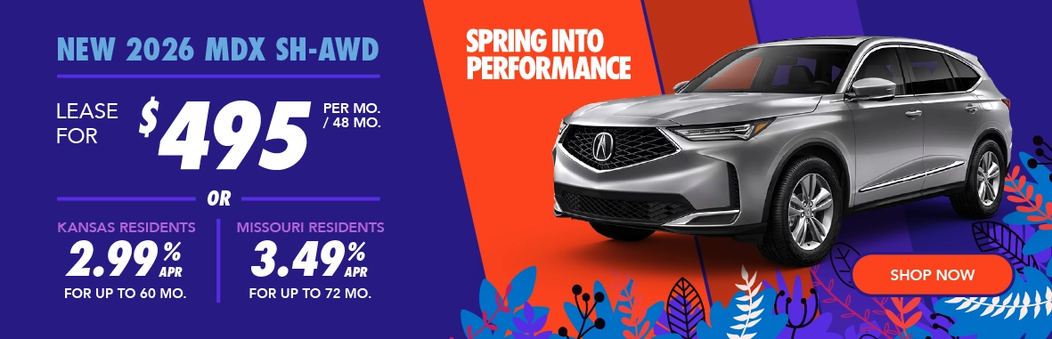 *Offers subject to change. See dealer for details. Lease does not include tax, tag, and title. Does not include dealer installed accessories, $565 administrative fee, or $600 color upcharge. New 2026 Acura MDX SH-AWD lease. $495/month for 48 months and 7,500 miles a year. $5,999 down. Dealers set actual prices. $1,000 cap cost reduction. Must qualify for Loyalty/Conquest Offer. Loyalty/Conquest Eligibility: Current owners of any 2011 or newer Acura, Audi, BMW, Buick, Cadillac, Genesis, Honda, Infiniti, Lexus, Lincoln, Mercedes Benz, Tesla or Volvo vehicle. For Kansas: 2.99% financing for up to 60 months. For Missouri: 3.49% for up to 72 months. Financing and special lease offers are available for well qualified buyers, and are subject to approval. Offers run 03/03/2026 through 03/31/2026.