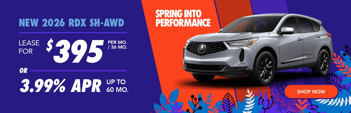 *Offers subject to change. See dealer for details. Lease does not include tax, tag, and title. Does not include dealer installed accessories, $565 administrative fee, or $600 color upcharge. New 2026 Acura RDX SH-AWD lease. $395/month for 36 months and 7,500 miles a year. $4,999 down. Dealers set actual prices. $1,000 cap cost reduction. Must qualify for Loyalty/Conquest Offer. Loyalty/Conquest Eligibility: Current owners of any 2011 or newer Acura, Audi, BMW, Buick, Cadillac, Chevrolet, Ford, Genesis, GMC, Honda, Hyundai, Infiniti, Kia, Lexus, Lincoln, Mazda, Mercedes-Benz, Nissan, Subaru, Tesla, Toyota, Volkswagen, or Volvo vehicle. 3.99% financing and special lease offer are available for well qualified buyers, and is subject to approval. Offers run 03/03/2026 through 03/31/2026.